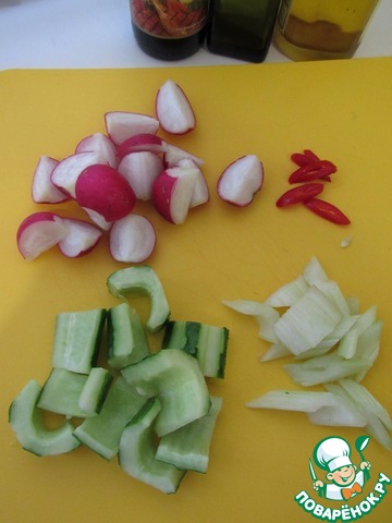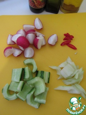 Редис разрезаем на 4 части. Из огурца удаляем семечки и режем дольками размером, как дольки редиса. Сельдерей очищаем от прожилок и нарезаем крупными перышками. От перца чили отрезаем 5-6 перышек вместе с семечками.