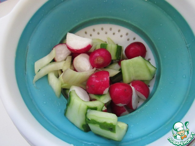 Огурцы, сельдерей и редис солим и перемешиваем. Даем постоять минут 15-20 чтоб вышла лишняя жидкость. Сливаем и промываем от соли. Просушиваем.