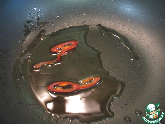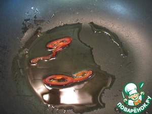 Наливаем растительное и кунжутное масло. Раскаляем и обжариваем в нем на сильном огне перец чили 20-30 секунд. -