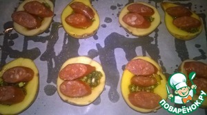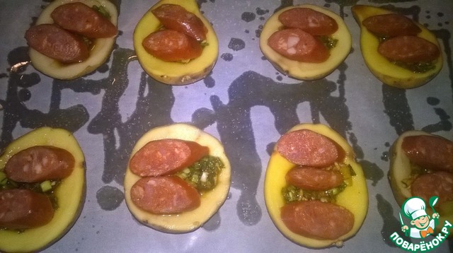 Колбаску порезать ломтиками и выложить на картофельные половинки