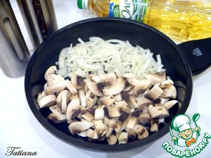 Шампиньоны почистите, произвольно порежьте лук и грибы, обжарьте в небольшом количестве подсолнечного масла, посолите, поперчите.