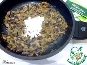 Добавьте майоран и муку, перемешайте и прожарьте пару минут, чтобы мука запассеровалась. Постоянно помешивая, добавляйте в грибную зажарку горячую воду, до желаемой густоты (примерно 200 мл. воды).