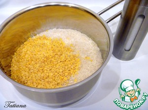 Приготовьте рис с чечевицей. Для удобства варки круп в одной кастрюле, подберите сорт риса, который варится такое же количество времени, что и чечевица. В моем рецепте используется желтая чечевица и рис басмати, для обоих видов круп, время приготовления=20 минут. Оба вида крупы промойте, поместите в кастрюлю, влейте подсоленную воду (на 2 чашки крупы=4 чашки воды+1 ч. л. соли)Варите под крышкой на медленном нагреве 20 минут. Вода должна впитаться в крупу.