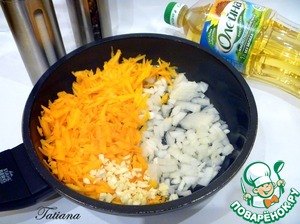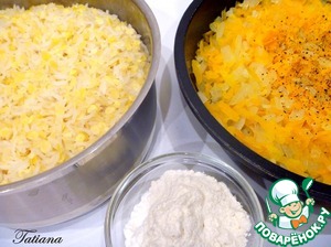 Тыкву натрите на крупной терке, лук и чеснок мелко нарежьте. Потушите овощи на подсолнечном масле до полуготовности, посолите, поперчите.