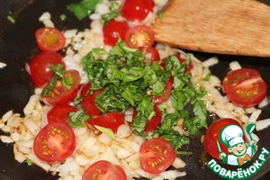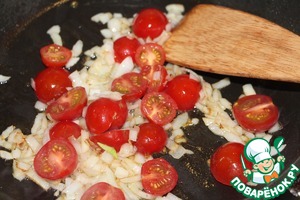 • К луку добавить помидоры черри, порезанные пополам. Тушить 3 минуты.