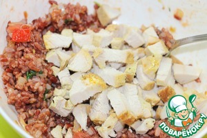• Теплый салат из красного риса с овощами и грилованной грудкой готов.
