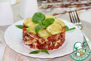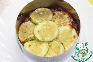 • На подогретую тарелку выложить сервировочное кольцо, выложить основу, прикрыть слоем кабачков
