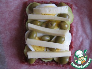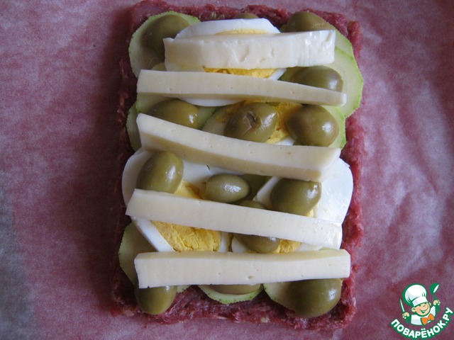 Снизу фарш, в середине оливки с яйцами и сыром, сверху фарш. Жарим, перевёртывая. Что, иная технология в той бумаге, которую лепим, а потом убираем? Т.е., ерундой занимаемся. Или в том, что начинка не замурована фаршем, а свободно растекается (сыр)?