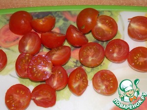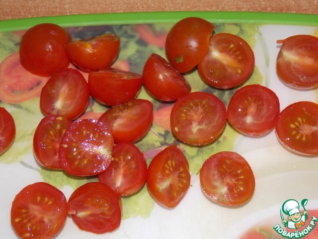 Помидорки черри разрезать пополам.