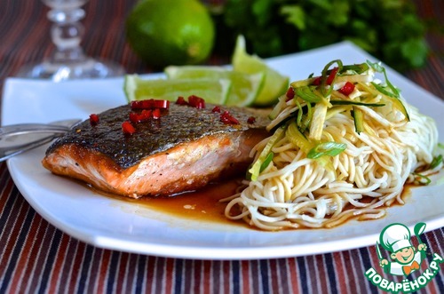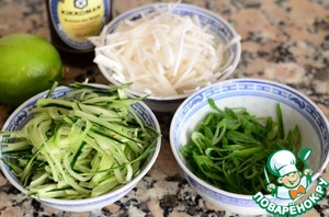 1. Отварить лапшу до готовности и приправить 1 ст. л. растительного масла. Порезать редьку и огурец тонкой соломкой, зеленый лук тонко порезать по диагонали.