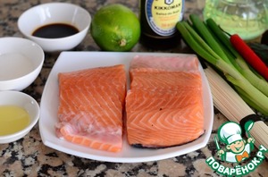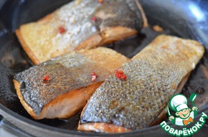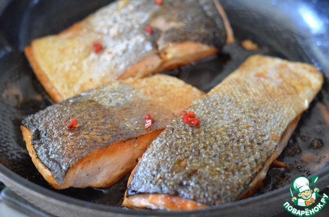 3. Рыбу жарить на растительном масле сначала кожицей вниз на среднем огне 5 минут, чтобы она стала золотистой и хрустящей. Затем слить со сковороды весь жир, перевернуть рыбу, влить половину глазури и готовить еще 3 минуты, постоянно поливая соусом (глазурью).