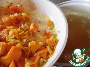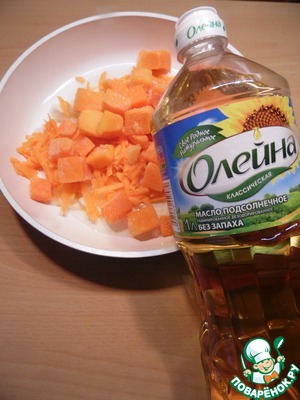 • Лук мелко нашинковать, морковь натереть на крупной терке, имбирь измельчить, тыкву очистить, нарезать кубиками (у меня была замороженная). Подготовленные овощи обжарить на растительном масле ТМ "Олейна" 5–7 минут.
