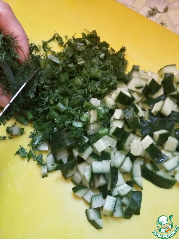 Огурец нарезать небольшими кубиками, зелень измельчить.