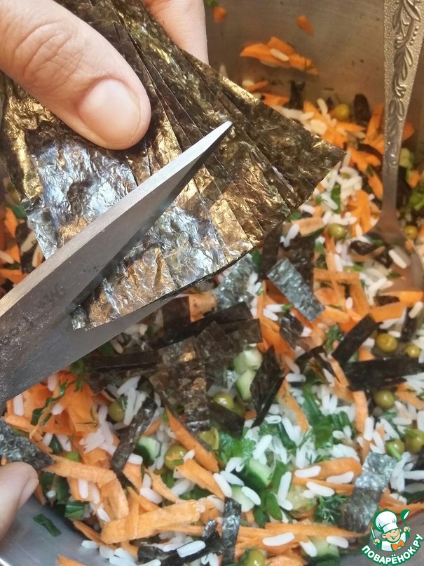 Листья нори нарезать на полосоки шириной 2 см и нашинковать как лапшу (удобно это сделать ножницами)