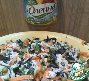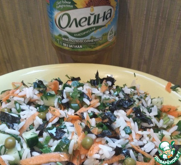 Добавляем нори к салату, солим, заправляем соевым соусом и маслом и перемешиваем.