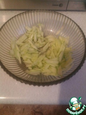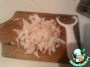 Крабовые палочки нарезаем соломкой. Я использую вот такой нож, но можно и обычным