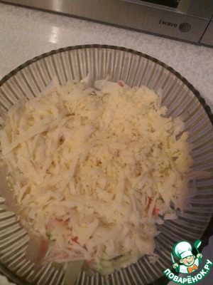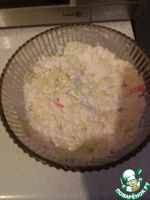 Майонез смешиваем с лимонным соком и чесноком. Чеснок пропустить через давку. Добавляем в салат. Перемешиваем.