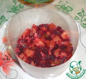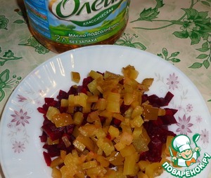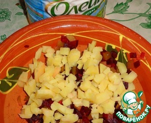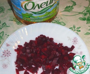Отварную свеклу порезать кубиками.