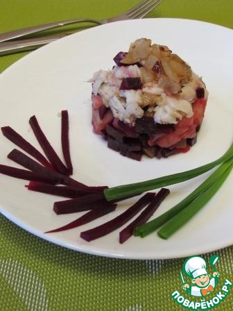 Сытный и даже праздничный постный слоеный салат из рыбы и овощей.
