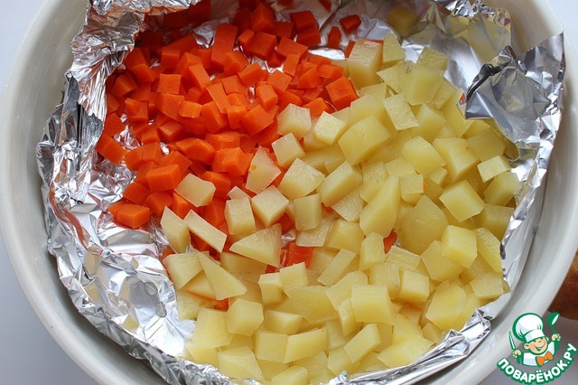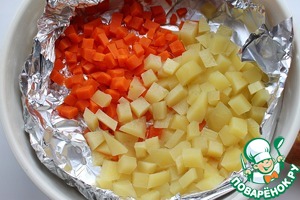 Картофель и морковь почистить и нарезать небольшими кубиками. Немного посолить и поперчить и приготовить на пару в течение 20 минут. (Можно отварить обычным способом и нарезать кубиками.)