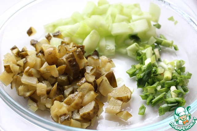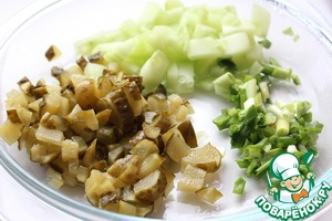 Обычный (при необходимости снять кожицу) и маринованные огурцы нарезать небольшими кубиками. Зеленый лук мелко измельчить.