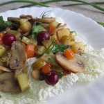 Смешать все ингредиенты, заправить. На тарелку выложить листья пекинской капусты, сверху салат. Украсить клюквой и зеленым луком.