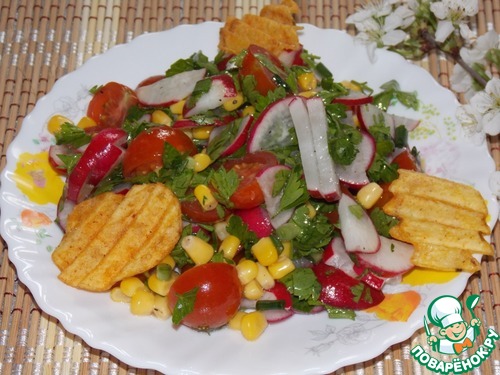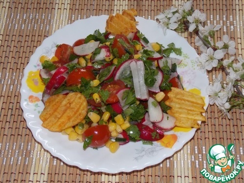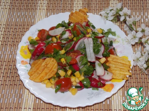 Все ингредиенты смешать, заправить маслом, посолить и поперчить по вкусу. Выложить салат на блюдо, украсить чипсами.