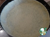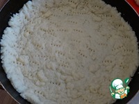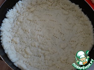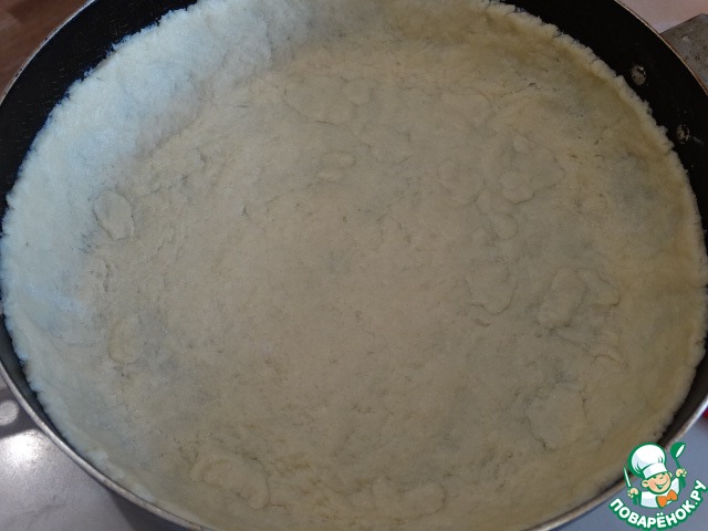 Тесто распределить руками по форме, сформировав бортики высотой 3-4 см. Наколоть вилкой и отправить в разогретую до 180 градусов духовку на 5 минут для подъема. |