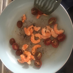 Обжариваем креветки и помидоры на оливковом масле около 4 минут.