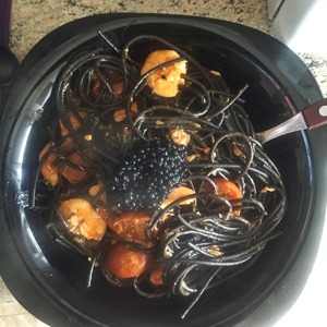 Черные спагетти с морепродуктами.