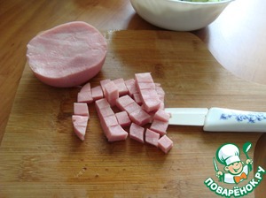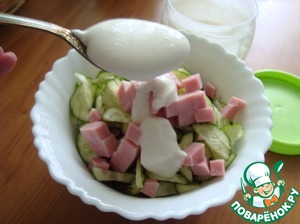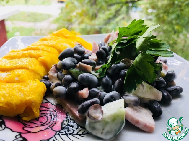 Салат с консервированной красной фасолью, с ветчиной из индейки и яичным блином, заправленный домашним майонезом, который сделан на жидкости из-под этой фасоли.