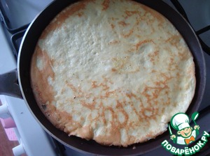 Сковороду разогреваем, подмазываем маслом и выливаем яйца, чтобы они растеклись тонким слоем. Жарим блин с одной стороны.