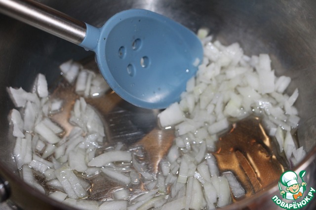 В кастрюле с толстым дном разогреть растительное масло, положить лук и чеснок, обжарить до мягкости, не давая луку зажариться, минут 5-7. -