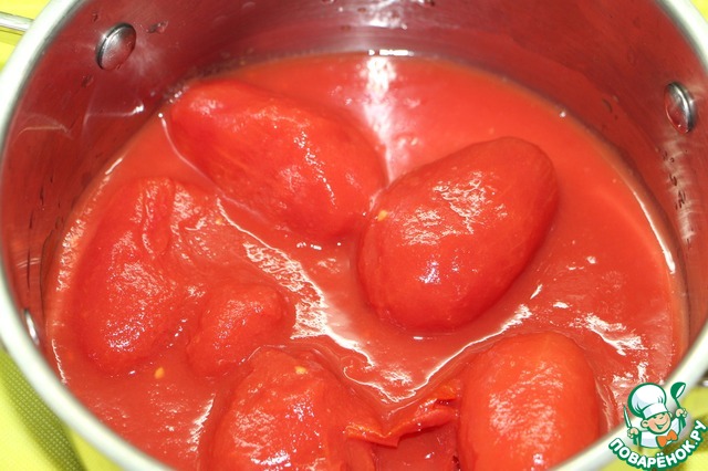 В другую кастрюлю влить помидоры вместе с жидкостью