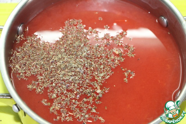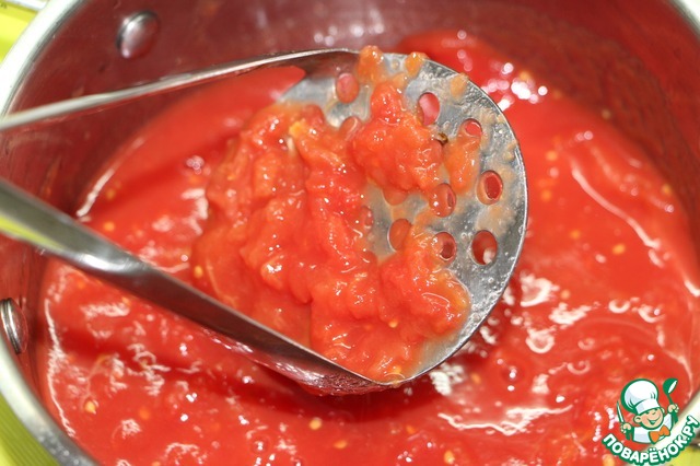 Влить половник помидорной жидкости, стараясь не зачерпывать мякоть. Готовить на среднем огне.