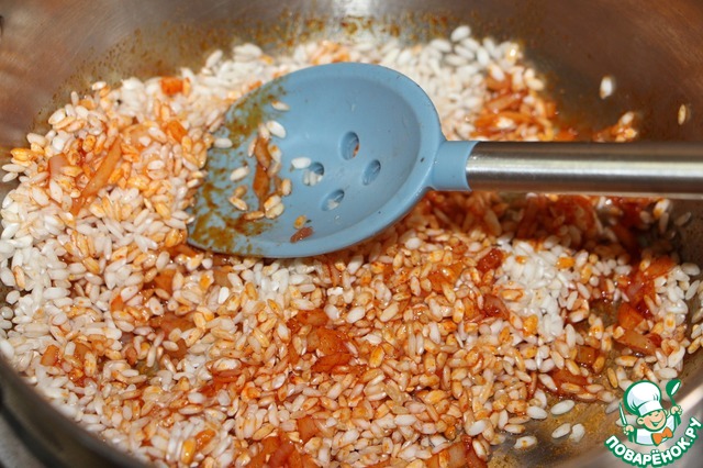 Добавить рис Арборио, тщательно перемешать