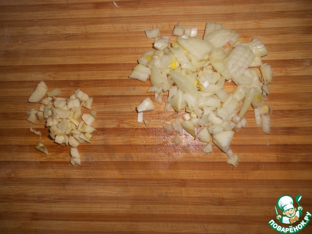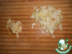 Очистите и нарежьте чеснок и лук.