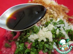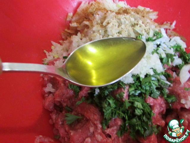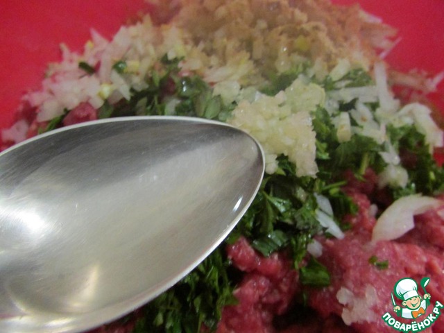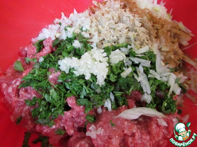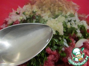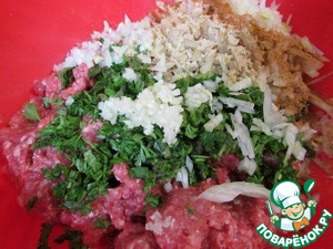 В миске смешать фарш, лук, чеснок, зелень. Добавить все специи. Хорошо все перемешать.
