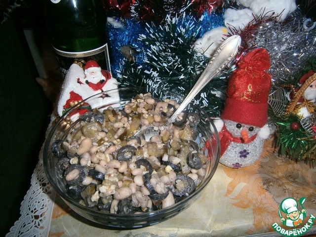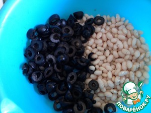 К отварной остывшей фасоли добавить маслины, нарезанные кружочком.