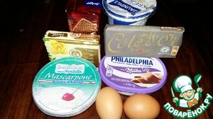 250 гр. сливочного сыра "Маскарпоне" соединить с 175 гр. шоколадного сыра "Филадельфия", сахаром, сметаной и яйцами. Все размешать.