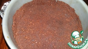 Шоколадное печенье измельчить любым удобным для Вас способом. Я это делаю моментально при помощи скалки. Смешать печенье с растопленным сливочным маслом до состояния "мокрого песка". Выложить на дно формы /у меня 18 см./ и утрамбовать /я это делаю при помощи плоской ложки/.