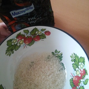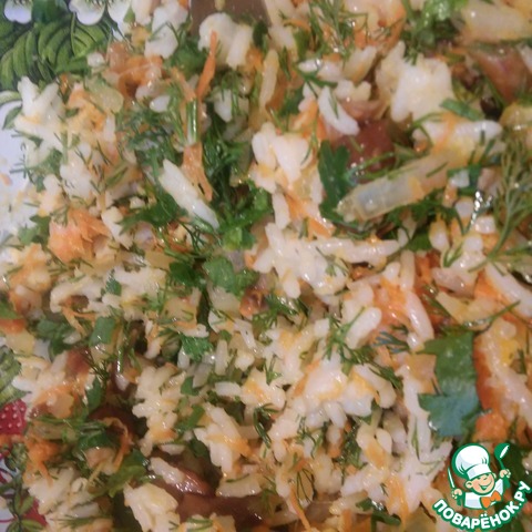 4. Смешать рис с луком и морковью. Грибы маринованные мелко нарезать.