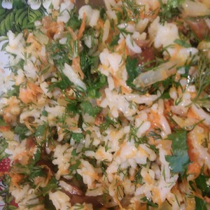 Ее порезать, добавить к рису. Туда же мелко нарезанную зелень. Заправить соевым соусом.