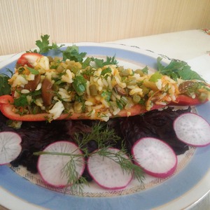 6. Разделить начинку. Первая постная часть, ей заполняем перец