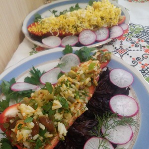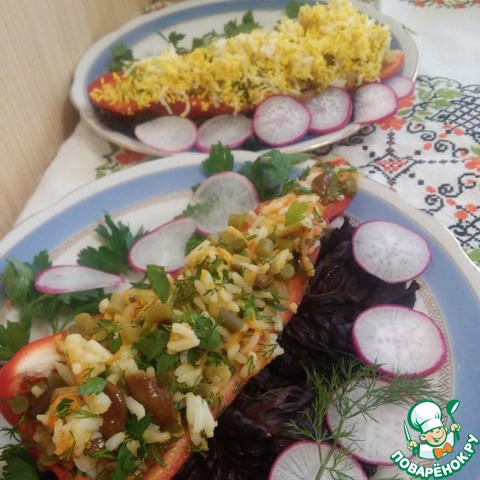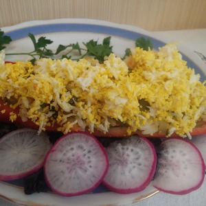 7. Второй частью тоже наполнить перец и сверху присыпать натертым яйцом на мелкой терке.