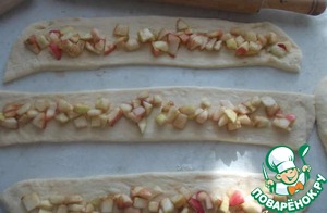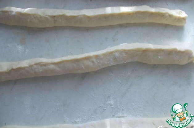 Каждый прямоугольник разрезать на три полоски и выкладываем часть начинки.