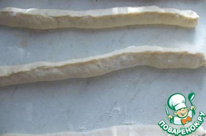 Тесто разделить на 2 части. Каждую часть раскатать в прямоугольник.