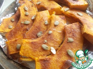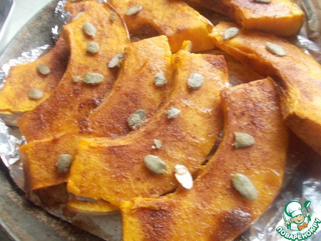 Тыкву помыть, очистить от семян, но корочку оставить. Порезать дольками. Складывать нужно на противень с фольгой.
