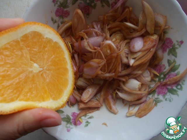 • Лук порезать полукольцами и немного подавить рукой или вилкой, чтобы стал мягким. Для тех, кто не любит резкого аромата лука, может обдать слегка кипятком. Налить соевый соус и выжать пару ложек апельсинового сока.