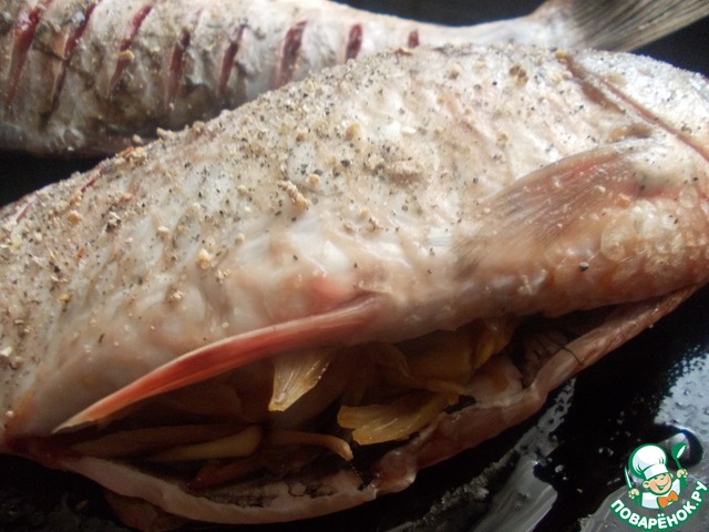• Рыбку хорошо почистить, помыть, сделать надрезики с двух сторон. У меня была с икрой, я ее там и оставила. Рыбу посолить и присыпать лимонным перцем, смазать маслом противень и саму рыбу.